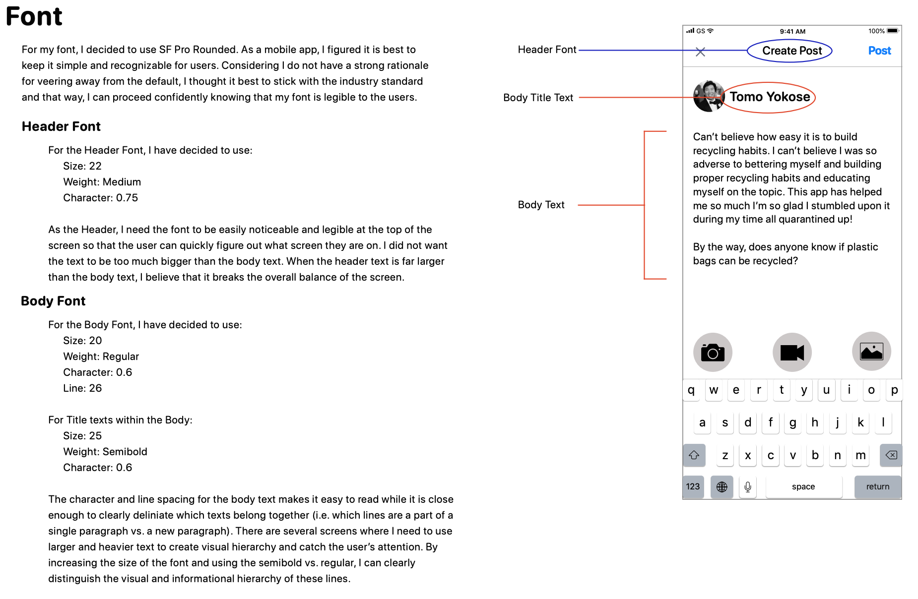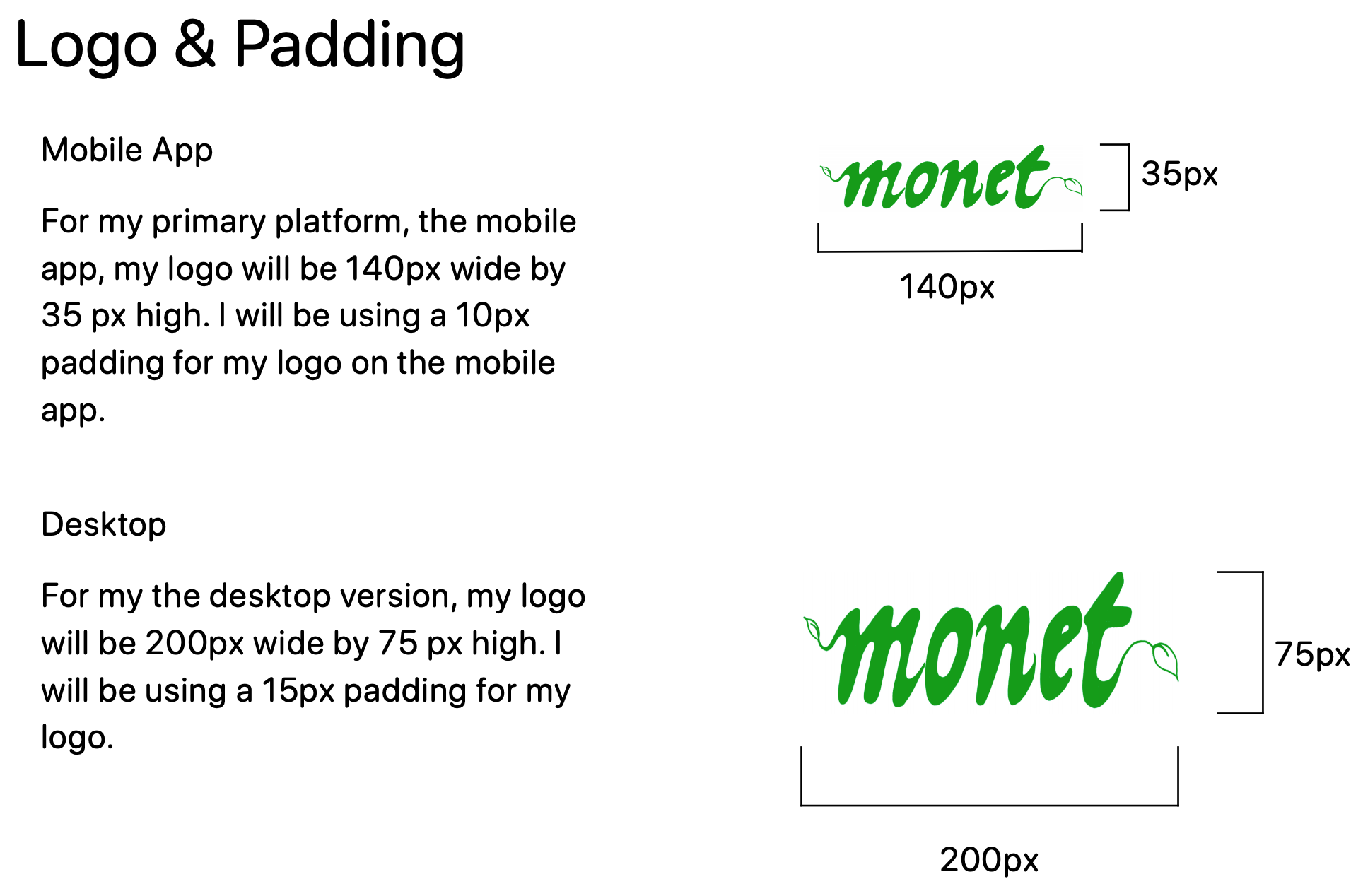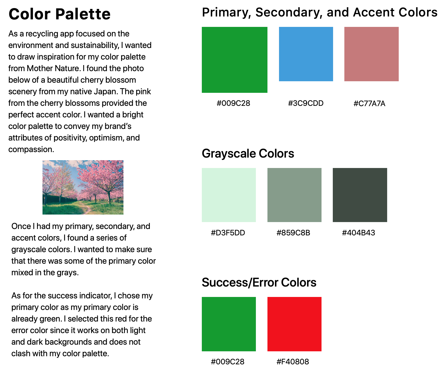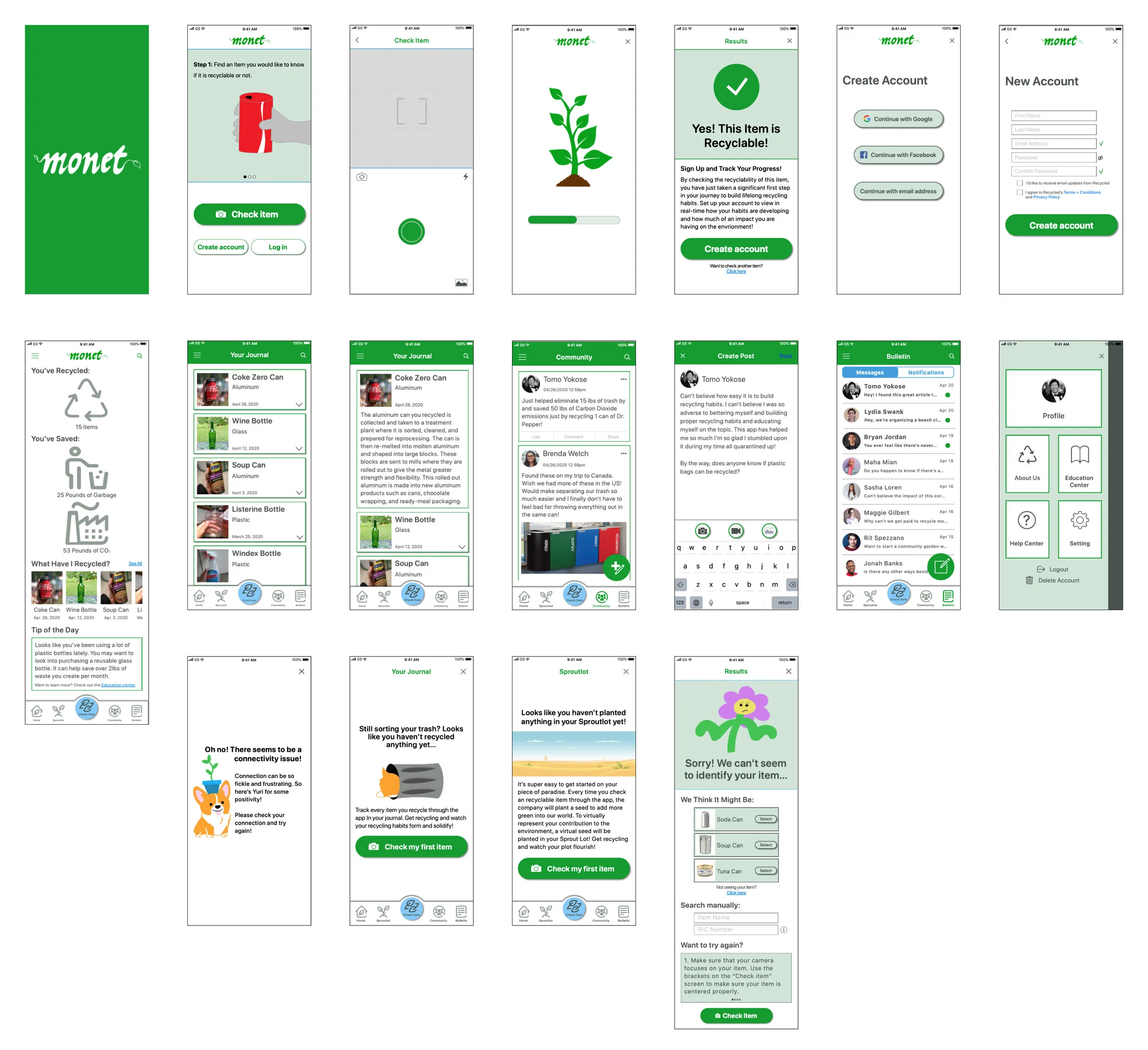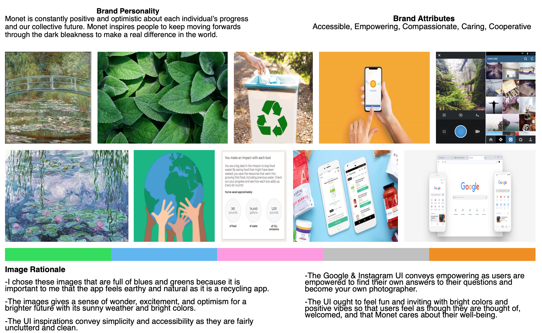 It was critical that the visual design of my app effectively conveyed the brand personality and attributes including positivity and optimism. As a brand, we are persistently hopeful that an individual’s recycling effort can truly make a difference. It was important that the app felt very clean and spacious since the app aims to keep the Earth clean. Additionally, I chose green as the primary color for my app since the brand is working towards a world full of lush, green landscapes like those in Claude Monet’s paintings (hence the app name “Monet).