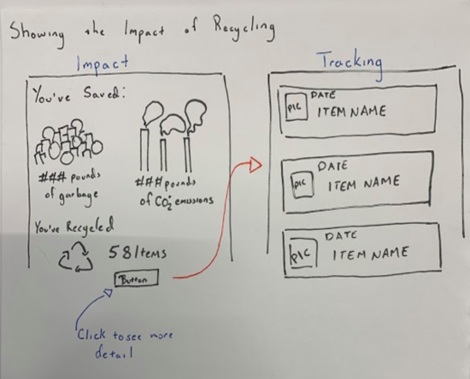 Participants were a bit confused as to why the images were so much bigger than the recycling metrics. Additionally, several participants stated that the metrics were not presented in a particularly interesting/fun or an effective manner and thus, they needed to do a bit of searching for the numbers. Based on these insights, I made iterations to the main screen to make sure that the key recycling metrics catch the user’s attention so that they truly understand the growing impact of their recycling efforts.