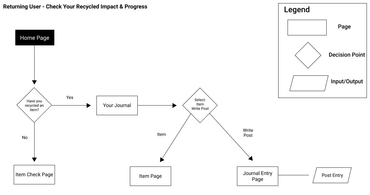 Your Journal lists each item the user has recycled through the app. Users appreciated the functionality of the journal, but wished there was a way to quickly know how many items were in the journal. Without knowing how many items were in the journal, users were confused about how much they would need to scroll down. Additionally, participants mentioned wanting to know how many of what kind of items were recycled.