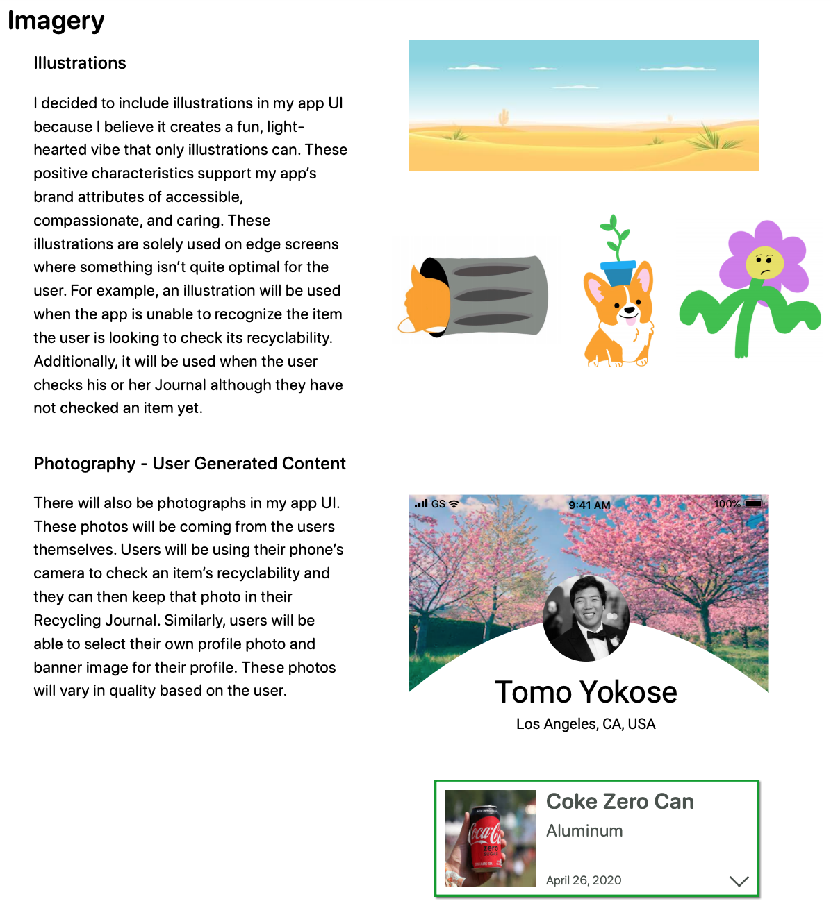 Considering the Aesthetic and Minimalist Design heuristic does not mean that my designs are flat and boring or merely sparse. For example, the Your Journal screen has plenty of information and images that fill the screen. However, the content and visual design of this screen focuses on the essentials. It helps the users know what the primary goal of this screen is, which is to see all the item the user has recycled using the app.