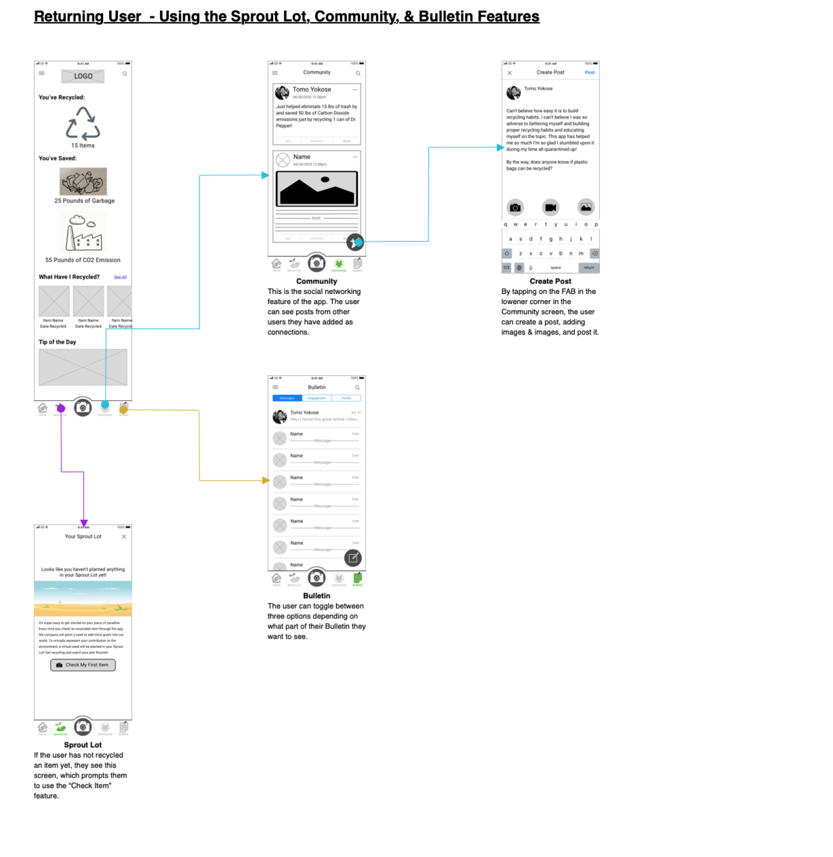 Reflecting upon the user stories and early ideations that I created, I was able to identify several red routes that would help solve the overlapping problems for my two personas. I created the user flows for these red routes: