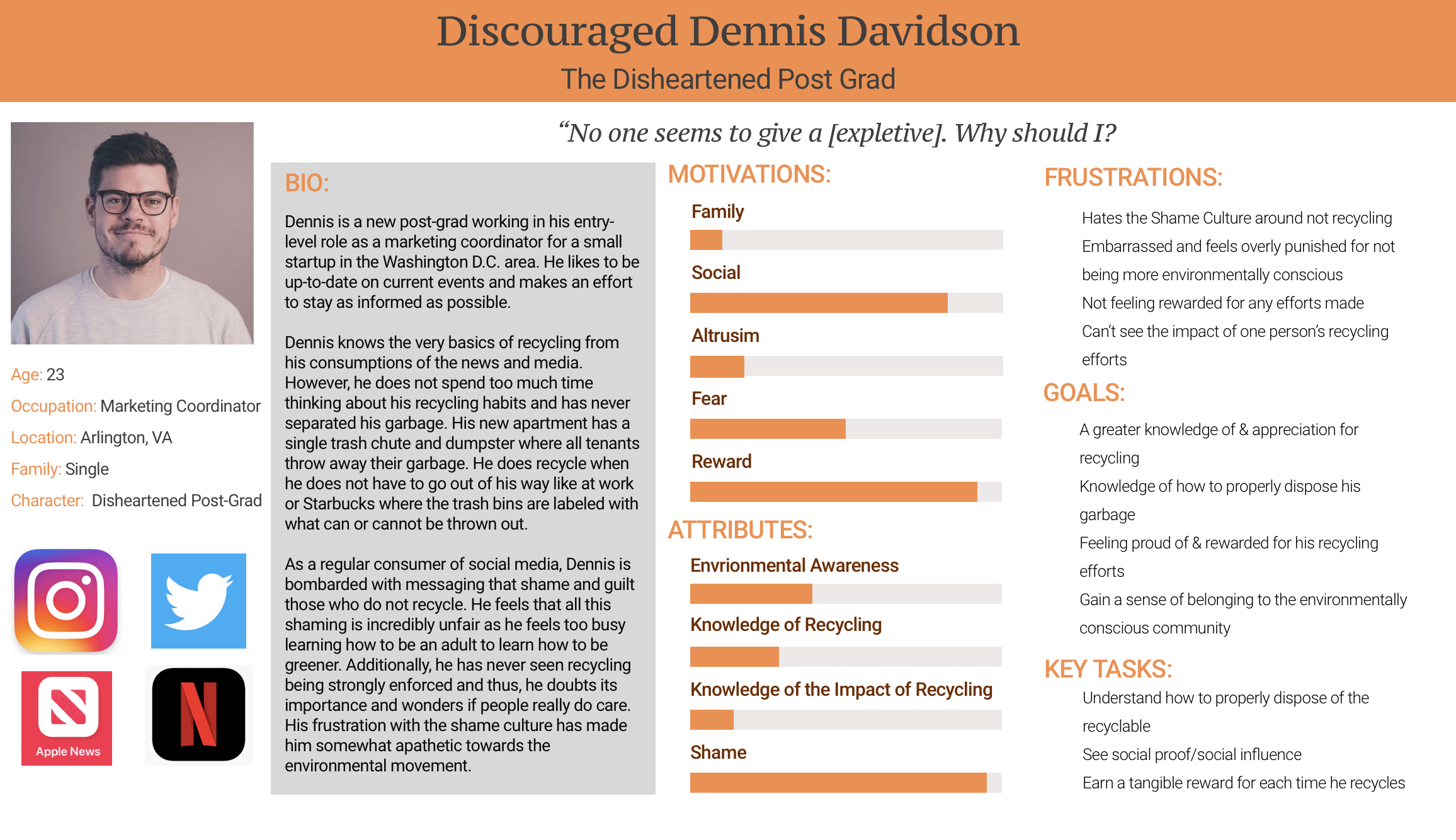 Dennis knows the very basics of recycling from his consumption of news and media. However, he does not spend too much time thinking about his recycling habits and has never separated his garbage. As a regular consumer of social media, Dennis is bombarded with messaging that shame and guilt those who do not recycle. He feels that all this shaming is incredibly unfair as he feels too busy learning how to be an adult to learn how to be greener. Additionally, he has doubts regarding the importance of recycling and his frustrations with the shame culture has made him apathetic towards recycling.